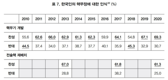 2012년 66.0%까지 올랐던 핵무기 개발 찬성 응답률은 한반도 평화 분위기가 조성되던 2018년 역대 최저인 54.8%까지 떨어졌지만 이후 상승 반전해 2019년 67.1%에 이어 지난해 69.3%까지 올랐다.