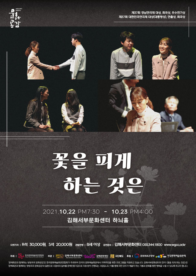 한편 김해서부문화센터의 연극 '꽃을 피게 하는 것은'은 2021년 문예회관과 함께하는 '방방곡곡 문화공감 사업’의 일환으로 열린다. 해당 사업은 한국문화예술회관연합회가 주최, (재)김해문화재단에서 진행하며 지역 문예회관에 우수 공연 프로그램을 유치함으로써 지역 주민에게 문화 향유 기회를 제공하기 위해 마련됐다. 동일 사업을 통해 오는 12월 헌정 콘서트 '엔니오 모리꼬네 심포니 시네마 콘서트' 또한 진행할 예정이다.