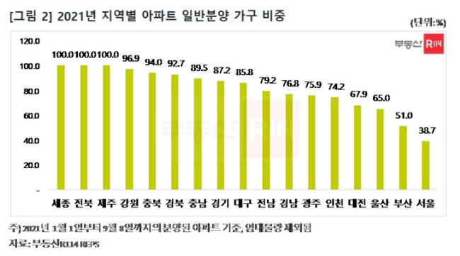 올해 시도별 일반분양 가구 비중은 ▲세종·전북·제주(100%) ▲강원(96.9%) ▲충북(94.0%) ▲경북(92.7%) ▲경기(87.2%) ▲대구(85.8%) ▲광주(75.9%) ▲인천(74.2%) 등으로 조사됐다.