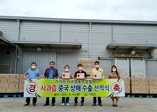 [시사뉴스 정윤철 기자] 거창군은 14일 가지리사과영농조합법인(대표 이복덕)이 이병주 농업기술센터 소장을 비롯한 관계자 5명이 참석한 가운데 사과즙 중국 상해 수출 선적식을 가졌다고 밝혔다.