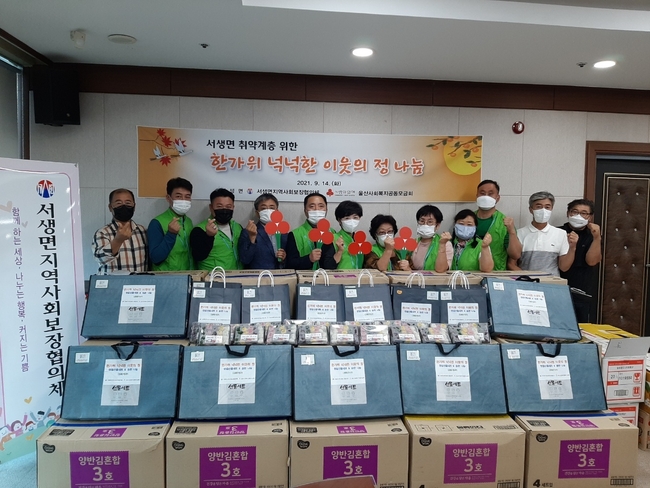 [시사뉴스 정윤철 기자] 서생면 지역사회보장협의체(공동위원장 최병수, 배근호)는 14일 서생면 행정복지센터에서 서생면 독거노인, 기초수급자 등 취약계층 200가구에 추석맞이 선물세트와 송편을 전달했다.