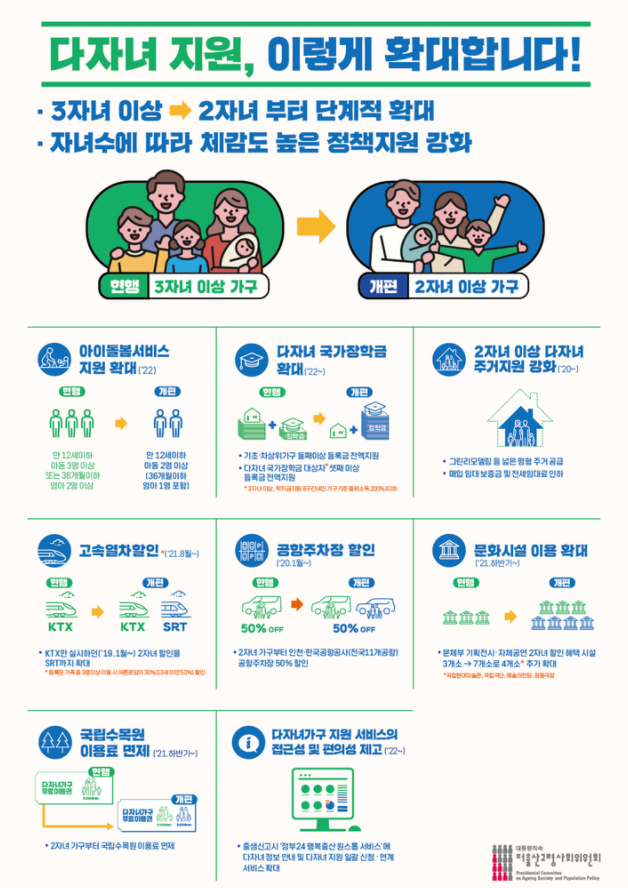 위원회는 제4차 저출산·고령사회 기본계획(2021~2025년)에 따라 다자녀 지원 기준을 2자녀로 완화한다고 15일 밝혔다.