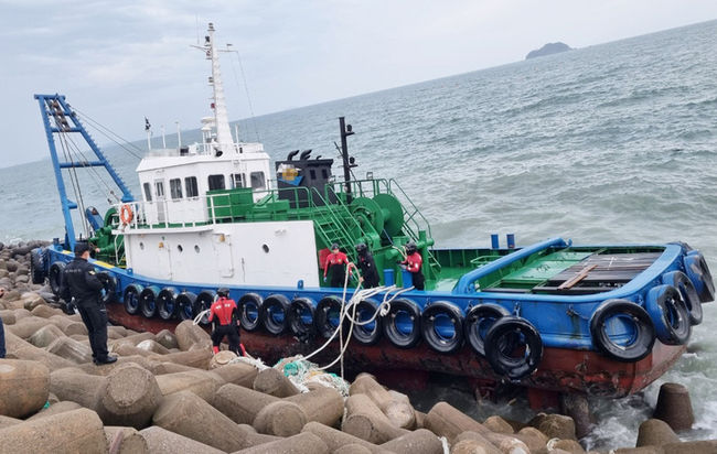 예인선은 인근에 있던 해상크레인 작업선에 묶여있다 줄이 끊어지며 표류, 해안가로 떠밀려 온 것으로 알려졌다.