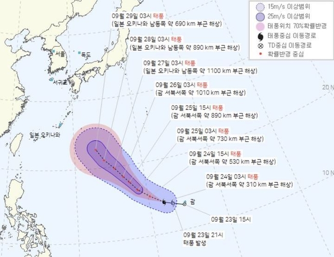 태풍은 26일까지 괌 해상에 머무르다 27일 오전 3시를 기해 일본 오키나와 남동쪽 약 1100㎞ 부근 해상에 진출할 전망이다.