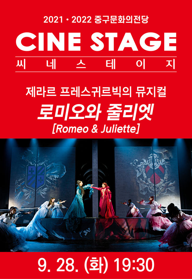 [시사뉴스 정윤철 기자] 공연예술계의 최신 트렌드, ‘영상으로 즐기는 명작무대’라는 콘셉트로 중구문화의전당(관장 한은숙)이 2019년부터 자체 기획 프로그램으로 운영 중인 ‘씨네 스테이지(Cine Stage)’의 올해 아홉 번째 작품인 제라르 프레스귀르빅의 뮤지컬 '로미오와 줄리엣'이 오는 28일 오후 7시 30분, 2001 프랑스 팔레 드 콩그레 극장 공연 실황으로 상영된다.