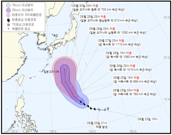 25일 기상청에 따르면 지난 23일 발생한 태풍 민들레는 이날 오전 9시 기준 괌 서북서쪽 약 810㎞ 부근 해상을 지나고 있다.