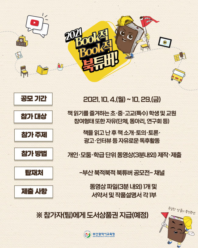 [시사뉴스 정윤철 기자] 부산광역시교육청(교육감 김석준)은 오는 10월 4일부터 29일까지 부산지역 초·중·고 학생과 교사들을 대상으로 유튜브 채널을 활용해 ‘2021 Book적Book적 북튜버!’ 한마당 행사를 연다.
