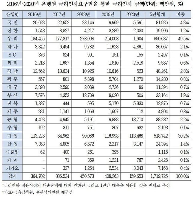 카카오뱅크 다음으로 기업은행(17만316명, 20.1%), 우리은행(9만3931명, 11.1%), 신한은행(5만3143명, 6.3%), 국민은행(4만7494명, 5.6%), 농협은행(3만7010명, 4.4%), 케이뱅크(2만9841명, 3.5%) 등 뒤를 이었다. 특히 우리은행은 지난 5년간 절감된 연 대출이자 8507억원으로 은행권 전체 실적의 49.5%로 압도적인 비중을 차지했다.
