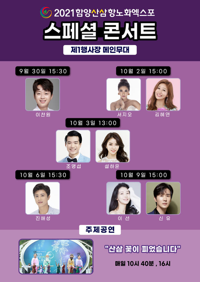 미스터트롯의 재간둥이 이찬원을 비롯하여 나태주, 진해성, 신유 등 트로트 대세들이 총출동하는 이번 스페셜 콘서트는 2021함양산삼항노화엑스포 제1행사장 메인무대에서 만나볼 수 있다.