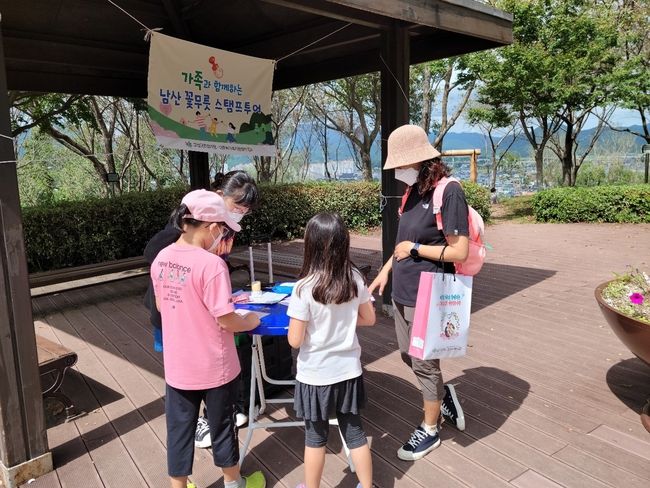 '가족과 함께하는 남산 꽃무릇 스탬프 투어'는 지역 명소인 남산공원을 방문해 특별 제작된 남산지도를 수령하고, 스탬프존을 찾아다니며 꽃무릇 가족사진 촬영, 보물찾기, 물병세우기 게임 등의 미션을 수행한 후 스탬프 지도를 완성하는 방식으로 진행됐다.