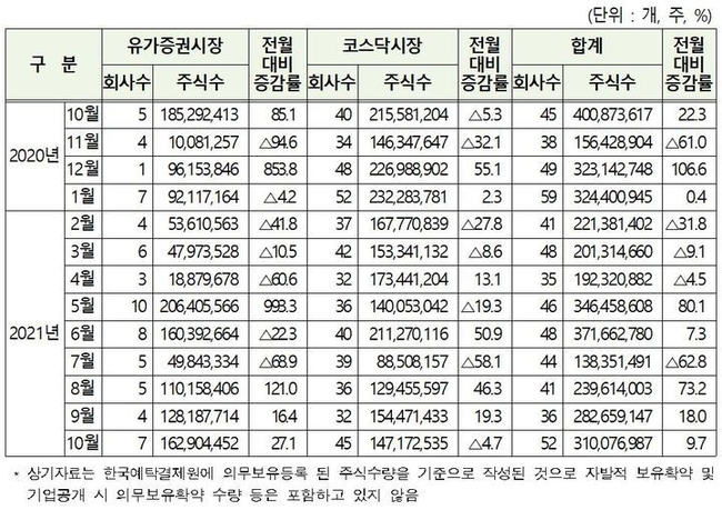 다음 달 중 의무보유등록이 해제될 주식수량은 전월(2억8266만주) 대비 9.7% 증가했으며 전년 동월(4억87만주) 보다는 22.6% 감소했다.