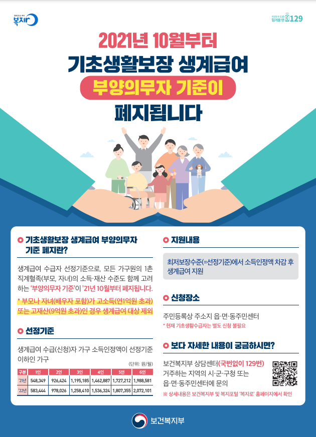 보건복지부는 2022년 1월부터 생계급여 수급자에 대한 부양의무자 기준을 폐지할 예정이었으나, 복지사각지대 해소 및 기존 수급자에 대한 보장 강화와 코로나19 장기화 등의 상황을 고려하여 3개월 당겨서 10월부터 시행하기로 했다.