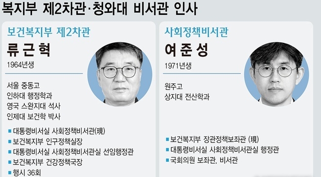 류 신임 복지2차관은 행시 36회로, 보건복지부 건강정책국장을 거쳐 대통령비서실 사회정책비서관실 선임행정관과 보건복지부 인구정책실장을 역임한 후, 다시 대통령 사회정책비서관으로 승진 복귀했다.