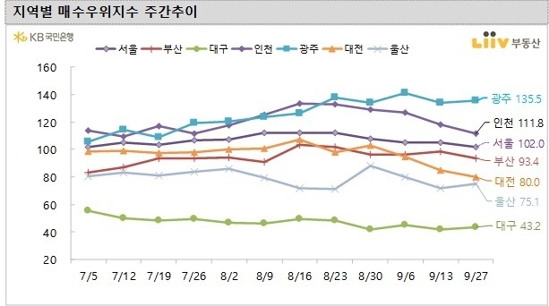 서울의 매수우위지수는 지난주(105.3)보다 하락한 102.0을 기록했다. 인천(111.8)을 제외한 5개 광역시에서는 광주의 매수우위지수가 135.5로 가장 높다. 부산 93.4, 대전 80.0, 울산 75.1, 대구 43.2으로 100 미만의 '매도자 많음' 시장을 보이고 있다.