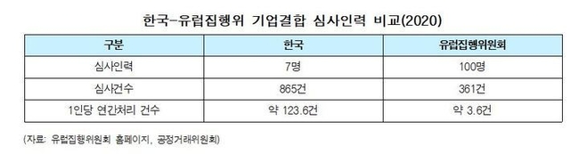 하지만 기업결합 심사를 담당하는 실무인력은 매년 7명으로 같았다. 1인당 평균처리 건수는 2016년 92.3건에서 지난해 123.6건으로 증가했다. 5년 사이 1인당 업무량이 34% 가까이 늘어난 셈이다. 지난해 EU 심사인력 100명이 361건을 심사해 1인당 연간 심사 건수가 3.6건에 그친 것과 대조적이다.