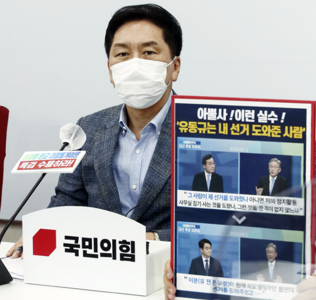 김 원내대표는 "이후보는 유동규와 적극 거리두기에 나섰지만 유씨의 걸어온 궤적은 그야말로 측근로드였다"라며 "이 후보는 민주당 경선 토론회에서 선거를 유동규가 도와줬나 반문하더니 또 선거도와줘야만 측근이냐는 식으로 말이 꼬였다. 자기가 놓은 덫에 걸렸다"라고 했다.