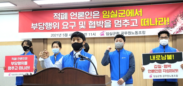 앞서 임실군 공무원노동조합은 기자회견을 열고 "적폐 언론인은 임실군에서 부당 행위 요구와 협박을 멈추고 떠나라"며 "경고를 무시하고 지속적인 악행을 저지른다면 전면 투쟁을 불사하겠다"며 A씨의 행위에 대해 경고한 바 있다.