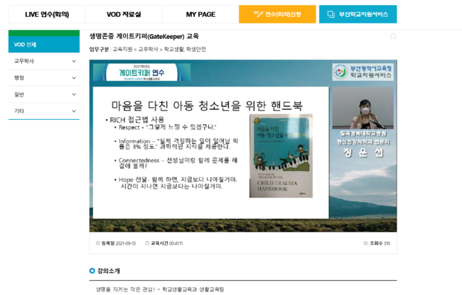 이번 교육자료는 코로나19 등으로 대면 연수가 어려운 학교를 위해 40여분 분량의 VOD로 제작했다.