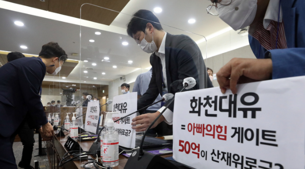 민주당은 '화천대유=아빠의힘 게이트' '50억원이 산재 위로금?' 팻말을, 국민의힘은 '이재명 판교 대장동 게이트 특검 수용하라' 팻말을 각각 자리에 붙이면서다. 다만 오후에는 여야 간사 합의로 모두 팻말을 떼고 국감을 이어갔다.