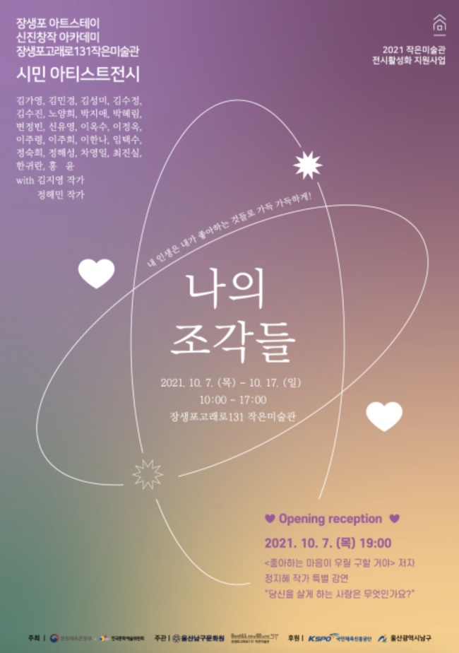 '나의 조각들'은 2021 작은미술관 공모사업 전시활성화사업으로 진행되고 있는 다섯번째 프로그램으로 지난 8월부터 진행한 장생포 아트스테이의 ▲수채화 원데이 클래스 ▲사진 3주 클래스 ▲책 만들기 6주 클래스(신진창작 아카데미) 강좌에 참여한 22명의 시민과 2명의 지역 작가가 함께 한다.
