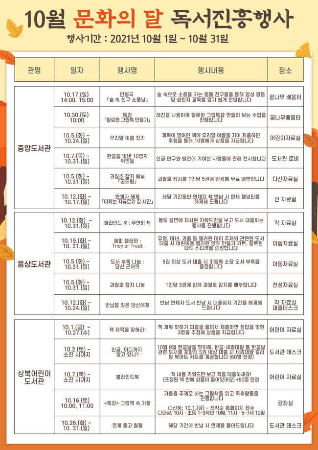 ‘할로윈데이’맞이 행사로 할로윈 분장을 하고 기념사진을 남길 수 있는 포토존과 도서 대출을 하면‘할로윈 팝업북’증정하는 행사가 있다. 그 밖에도 10월 29~31일까지 도서대출 후, ‘Trick or Treat!’을 외치면 사탕 및 초콜릿 꾸러미도 받을 수 있다.