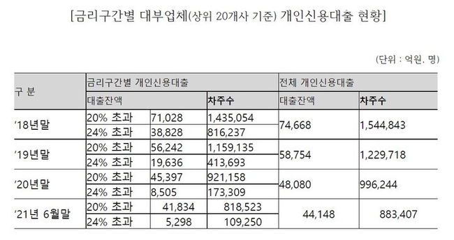 또 금리가 24%를 넘는 대출은 5298억원, 채무자는 10만 9250명으로 나타났다. 전체 채무의 12%를 넘어서는 수준이다.