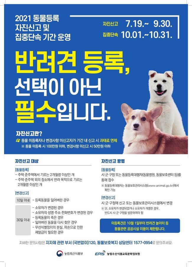 [시사뉴스 정윤철 기자] 창녕군(군수 한정우)은 지난 7월 19일부터 9월 30일까지 동물등록 자진신고 기간을 운영한 것에 이어 동물들의 유실, 유기 방지를 위해 10월 1일부터 31일까지 미등록 반려견 집중단속 기간을 운영한다.