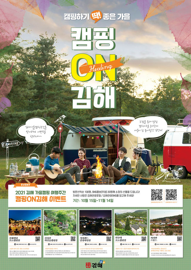 [시사뉴스 정윤철 기자] 김해시(시장 허성곤)는 단계별 일상회복(위드 코로나)을 앞두고 가을 여행수요와 지역관광 활성화를 고려해 10~11월 가을캠핑 여행주간 ‘캠핑 0N 김해’를 운영한다고 12일 밝혔다.