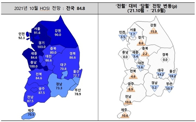 지역별 입주전망은 서울, 인천, 경기, 충남은 90~100선, 나머지 지역은 70~80선으로 나타났다.