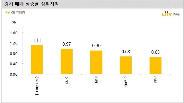 지역별로는 안산 상록구(1.11%), 오산(0.97%), 평택(0.90%), 의정부(0.68%), 군포(0.65%), 남양주(0.61%), 수원 권선구(0.6%) 등이 높게 상승했다.