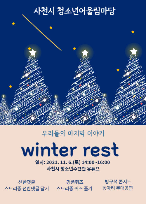 청소년수련관 관계자는 “관내 청소년들을 겨울휴식, 윈터레스트에 초대한다”며 “실시간으로 진행되는 이번 행사에 많은 관심과 참여를 부탁한다”고 말했다.