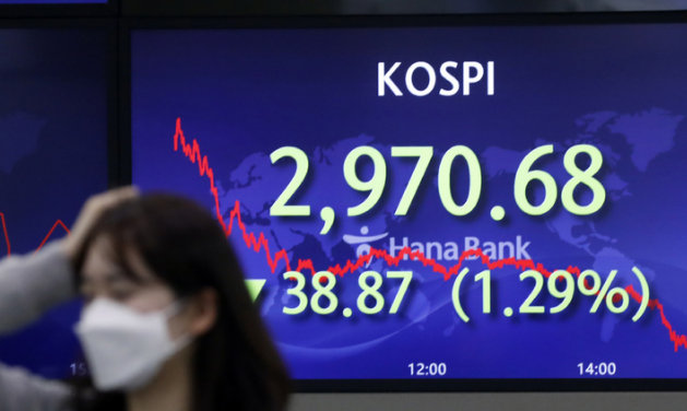 29일 한국거래소에 따르면 코스피는 전 거래일(3009.55) 대비 38.87포인트(1.29%) 하락한 2970.68에 장을 마쳤다.