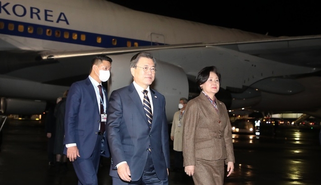 [시사뉴스 홍경의 기자] 7박9일 일정으로 유럽을 순방하고 있는 문재인 대통령은 31일(현지시간) 제26차 유엔 기후변화협약 당사국총회(COP26) 정상회의 참석을 위해 영국에 도착했다.