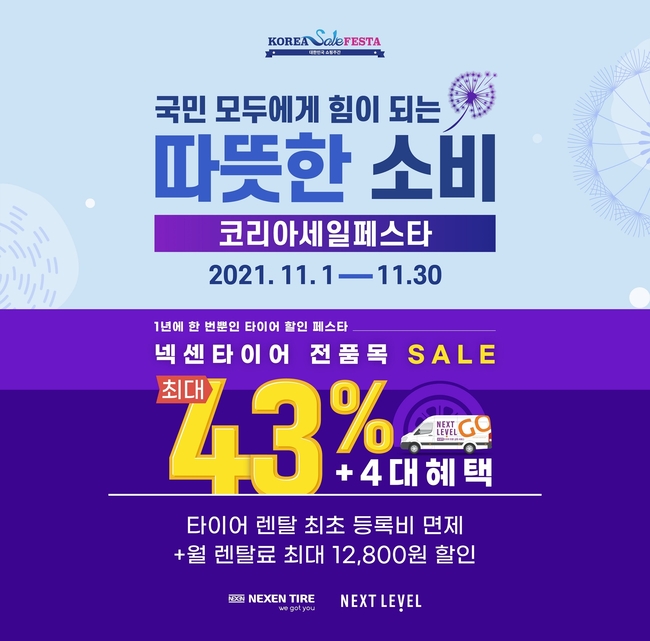 넥센타이어는 코로나 극복을 위한 따뜻한 소비를 주제로 11월 1일부터 30일까지 ‘넥스트레벨’ 온라인 공식몰을 통해 타이어를 할인 가격에 제공한다.