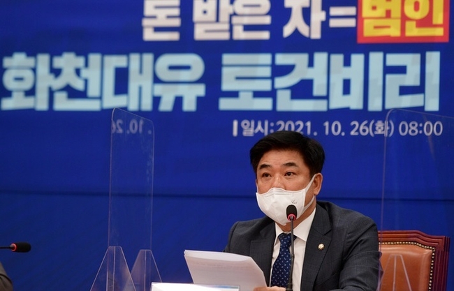 민주당 화천대유 토건비리 진상규명 태스크포스(TF) 단장인 김병욱 의원은 이날 오후 국회에서 기자회견을 갖고 "오늘 성남도시개발공사가 민간사업자들의 과도한 부당이득 환수를 위한 자체 조사 결과를 내놓았다. 공사(성남도개공)의 자체 조사 결과를 살펴보면, 일부 직원과 민간사업자(화천대유)가 뇌물 수수 및 공여 의혹에 이어 사업 과정에서 자신들의 이익을 늘리기 위해 관여한 의혹까지 불거져 있다"면서도 이같이 말했다.