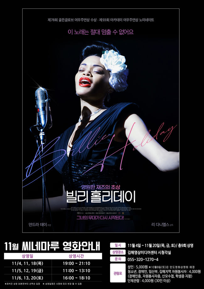[시사뉴스 정윤철 기자] (재)김해문화재단 김해문화의전당 영상미디어센터는 2021년 11월의 씨네마루 영화로 '빌리 홀리데이'를 상영한다.