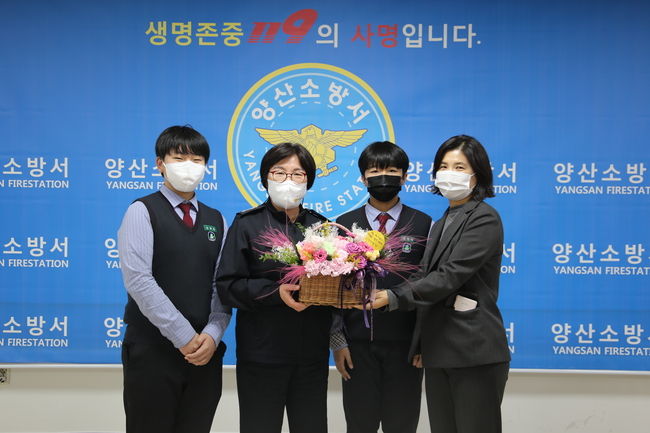 [시사뉴스 정윤철 기자] 양산소방서(서장 박정미)는 지난 2일 범어중학교 DIY 범어봉사단 학생들로부터 직접 만든 꽃바구니와 감사 인사를 받았다고 3일 밝혔다.