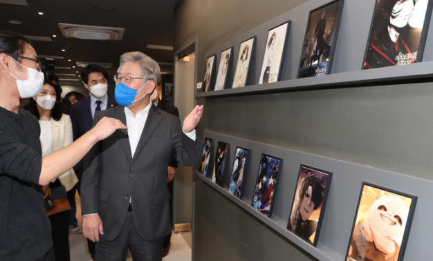 앞서 이 후보는 이날 부천테크노밸리에 위치한 한 웹툰 제작업체 전시실을 둘러보다 '오피스 누나 이야기'라는 작품 액자를 보고 "오피스 누나? 제목이 확 끄는데요"라고 말했다. 이에 관계자는 "성인물은 아니다'라고 설명했다.