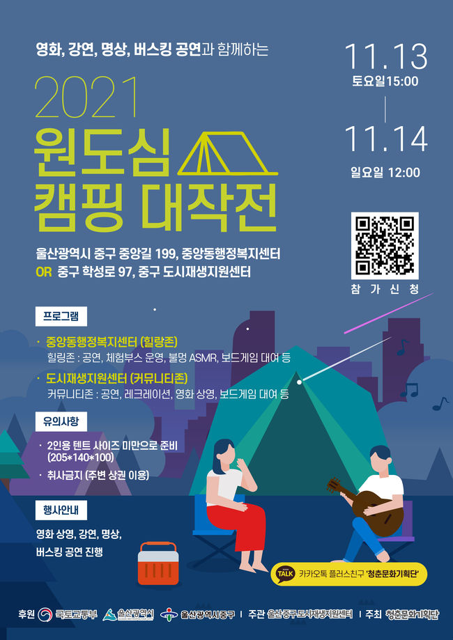 [시사뉴스 정윤철 기자] 울산 중구(구청장 박태완)가 가을밤의 낭만과 도심의 야경을 즐길 수 있는 이색적인 옥상 캠핑 프로그램을 운영한다.