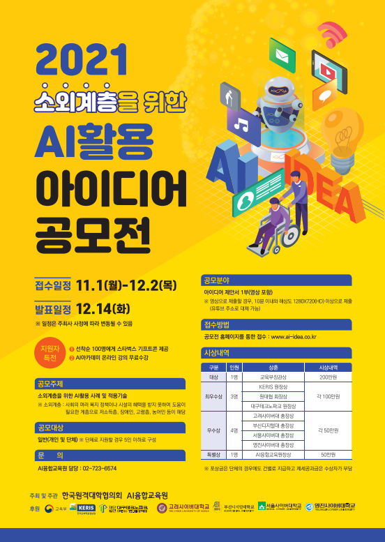 [시사뉴스 한지혜 기자] 전국 21개 사이버대학 운영 협의회체인 (사)한국원격대학협의회는 원대협 산하 AI융합교육원과 함께 AI 교육 활성화와 소외계층을 위한 AI 활용 사례 및 적용 기술 발굴을 위해 '소외계층을 위한 AI활용 아이디어 공모전'을 개최한다.