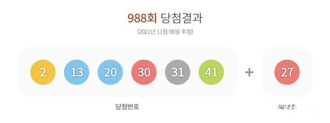 [시사뉴스 홍경의 기자] 6일 제988회 동행복권 로또 추첨 결과 '2, 13, 20, 30, 31, 41'이 1등 당첨번호로 결정됐다. 2등 보너스 번호는 '27'이다.