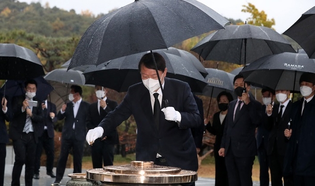 윤 후보는 이날 오전 이준석 대표, 김기현 원내대표 등 지도부와 함께 서울 동작구 국립서울현충원을 방문했다. 비가 내려 검은색 우산을 쓰고 분향을 진행했다.