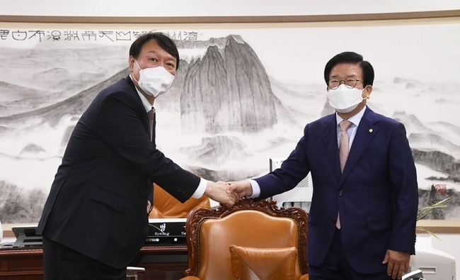 [시사뉴스 홍경의 기자] 윤석열 국민의힘 대선후보는 8일 박병석 국회의장과 만나 "저는 정치 시작한 지는 얼마 안 됐지만 대통령제가 제대로 자리를 잡으려면 그 나라의 의회주의가 제대로 자리를 잡아야 대통령제도 안착이 될 수 있다"고 말했다.