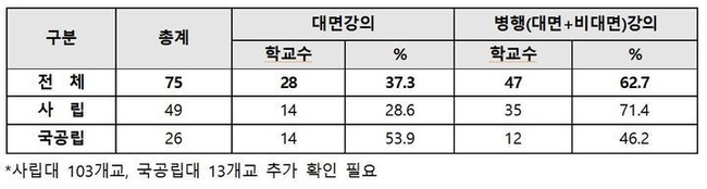 조사에 참여한 75개교 중 나머지 47개교(62.7%)는 대면과 비대면 강의를 혼합해 운영하겠다고 밝혔다.