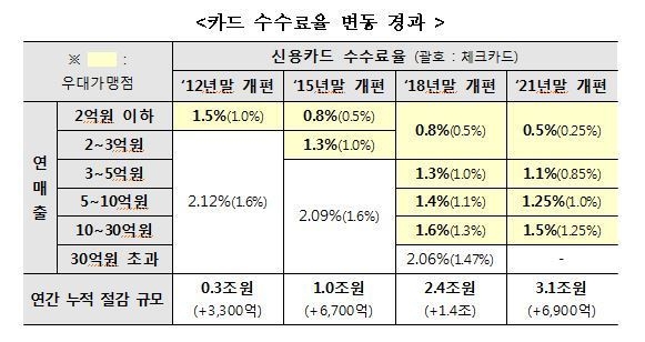 금융위는 지난해 추가적인 수수료 개편에 따라 제도 도입시 기대했던 영세 가맹점의 부담 경감 효과는 상당부분 나타날 것으로 봤다. 특히 연매출 3억원 이하 영세 가맹점 수수료율은 2012년 연 4.5%에서 올해 0.5%까지 낮아졌다.