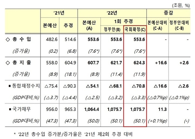 아울러 올해 1차 추경으로 국가채무는 1075조7000억원으로 본예산 전망치(1064조4000억원)보다 11조3000억원 늘었다. GDP 대비 국가채무비율은 50.0%에서 50.1%로 0.1%p 상승했다.