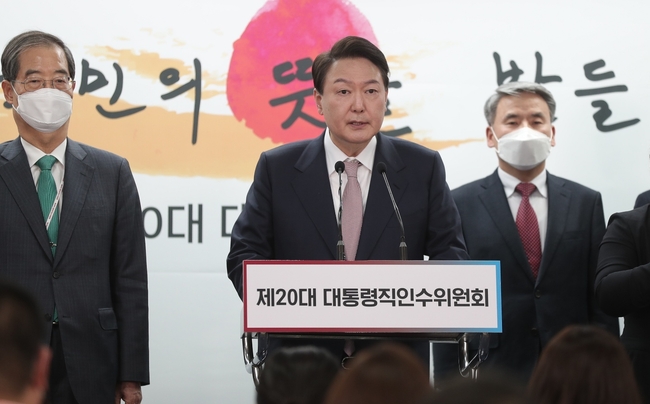 [시사뉴스 김철우 기자] 윤석열 대통령 당선인이 10일 초대 내각에서 함께 일할 8명의 장관 후보자를 발표하는 자리에는 한덕수 국무총리 지명자가 바로 옆에 섰다.