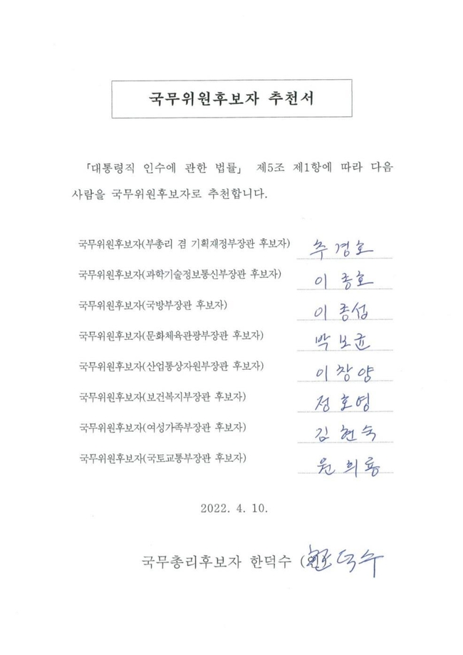 윤 당선인 측은 당선인이 총리 지명자의 국무위원 서면 추천을 통해 이번 국무위원 후보자를 인선했다고 설명하면서 그간 한덕수 국무총리 후보자 등과 여러 차례 회의를 통해 국무위원 후보자를 논의해 왔다고 밝혔다.