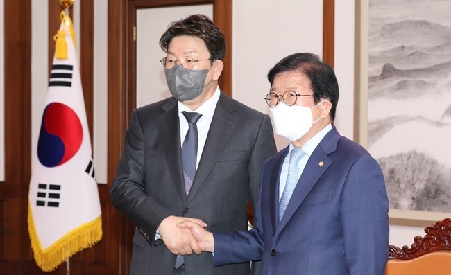 [시사뉴스 홍경의 기자] 박병석 국회의장이 11일 권성동 국민의힘 신임 원내대표의 예방을 받았다. 박 의장은 권 원내대표에 선출 축하 인사를 건네며 "윤석열 대통령 당선인에 쓴소리, 고언(苦言)을 하는 '윤고관' 역할을 해 달라"고 당부했다.