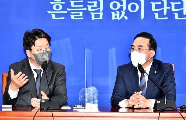 이후 박 원내대표가 국민의힘 당내 경선 압승을 거론하며 "그만큼 지혜와 경륜이 뛰어난 분이 앞으로 집권여당을 맡게 될 것 같아서 국민들의 기대도 높다"고 치켜세웠고, 권 원내대표도 "박 원내대표는 워낙 합리적인 분으로 정평이 나있고 의회의 중요성에 대해 누구보다 잘 알고 계시기 있기 때문에 든든하게 의지하겠다"고 호평하는 등 화기애애한 분위기가 이어졌다.